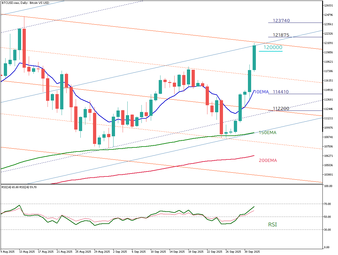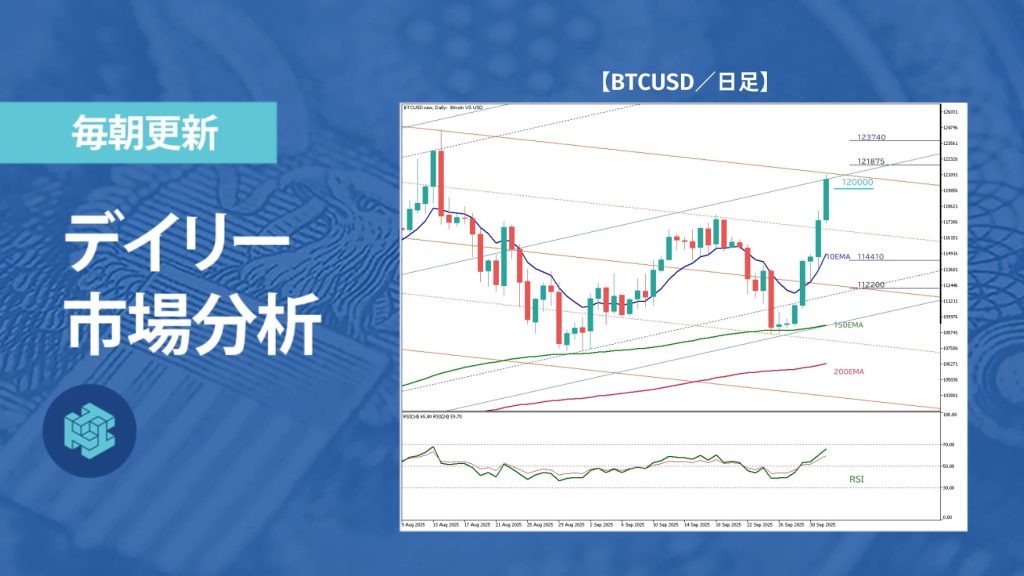 ビットコインは続伸し、心理的節目である12万ドルを突破。政府閉鎖下でも早期利下げ期待が支えとなり、長期保有者による売り圧力が緩和された可能性も上昇を後押ししたとみられる。