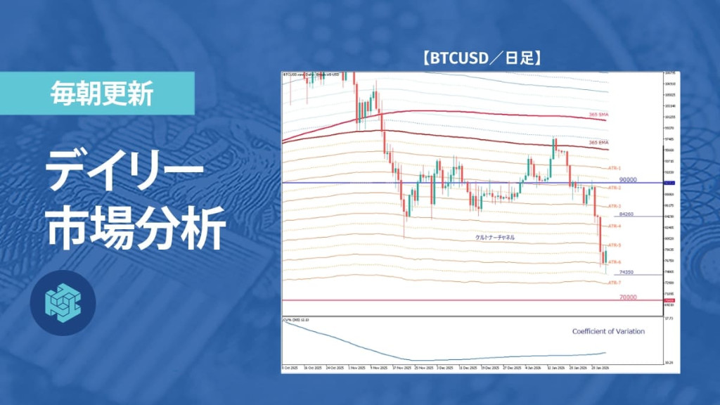 ビットコインは7.4万ドル台で下げ止まり、一時7.9万ドルを回復。ボラティリティ指標であるATRに沿った動きが続いており、統計的水準で反応しながら方向感を模索している。