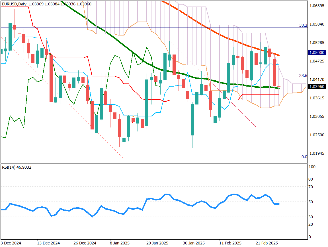 ユーロドルは3日連続で下落し、52日移動平均線を下回った。これはウクライナと米国の会談が決裂し、両者が激しく対立したことが主因である。会談決裂により停戦への期待が後退した。