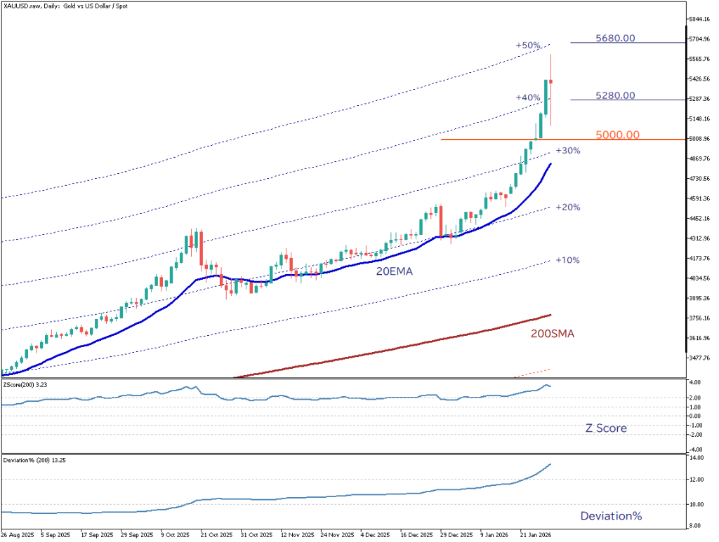200日SMA基準のエンベロープでは、+40〜50%帯まで乖離が拡大し、「Zスコア(200)」や「Deviation%(200)」といった統計的指標も異常値に達している。