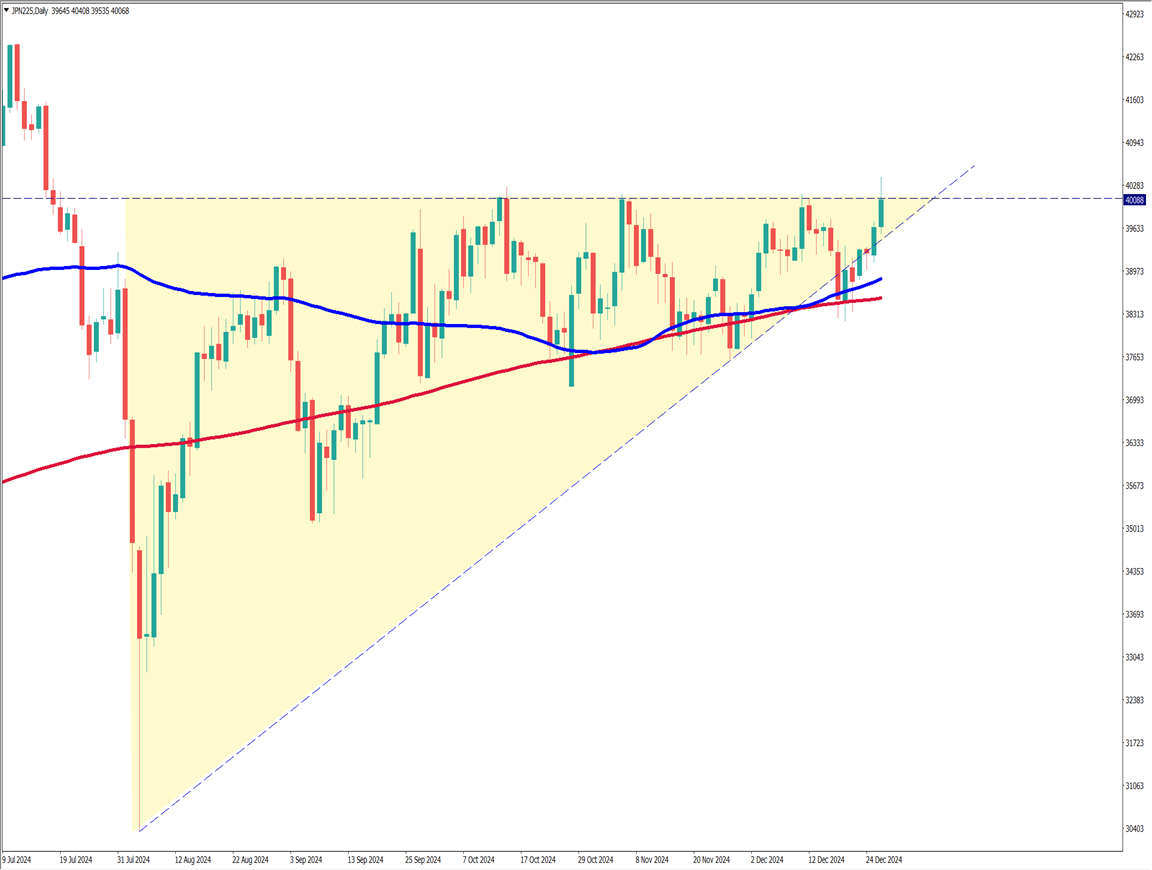日経平均株価の日足チャートを分析する。日経平均株価は4万円台に回復。サンタクロースラリーとなっており、240日移動平均線と72日移動平均線も傾きが上方向になっている。40080円がトライアングルの上限ラインになっており、2025年に上抜けできるかがポイントだ。