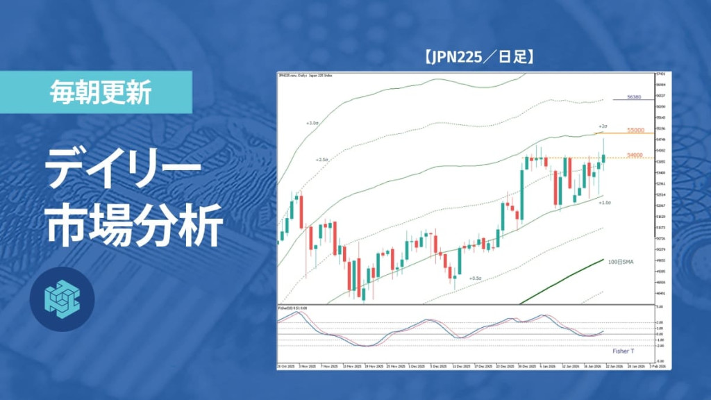 日経225(JPN225 Index)の日足チャートを分析する。価格は、100日ボリンジャーバンドの+1σを上回る水準で推移している。バンド上限に沿った上昇が続いており、変動幅の拡大を伴う上昇圧力が確認できる。