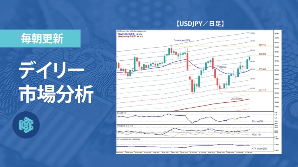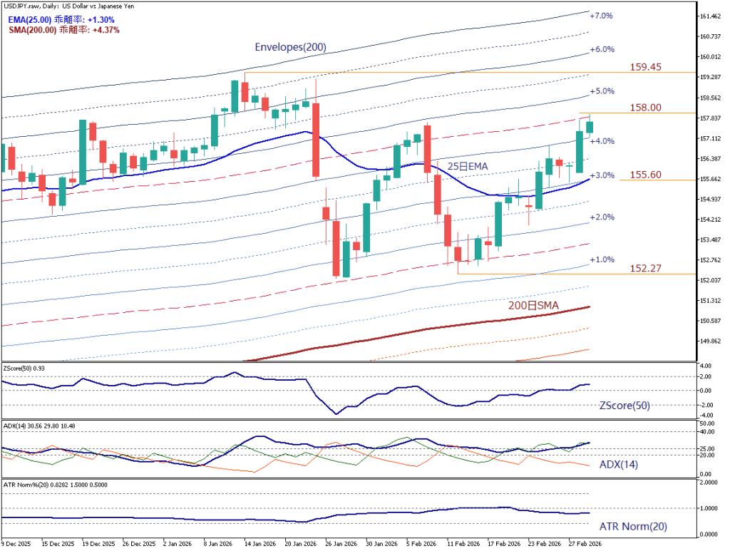 現在は200日SMAを上回る上昇基調の中で、急落後の戻りを試している局面である。エンベロープ+1.5%(下値152.27円)で反発した後、+3.0%水準(155.60円付近)を回復し、25日EMAの上に戻したことで、短期の下落圧力はいったん後退した。