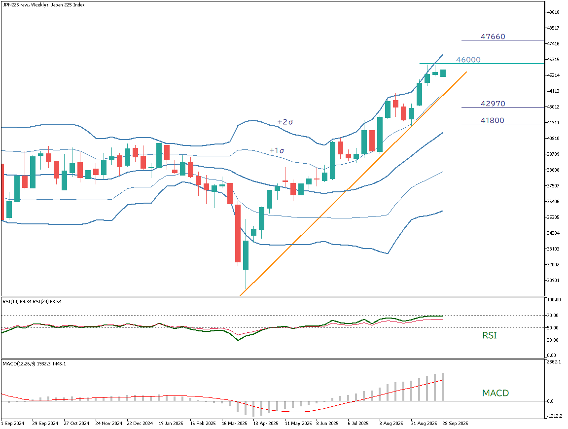 一方、直近では心理的節目である4万6000pt手前でいったん足踏みしており、短期的には上昇の勢いがやや鈍る可能性もある。上抜けた場合の上値目標は4万7660pt、下値は4万2970ptおよび4万1800ptが支持帯の目安となる。