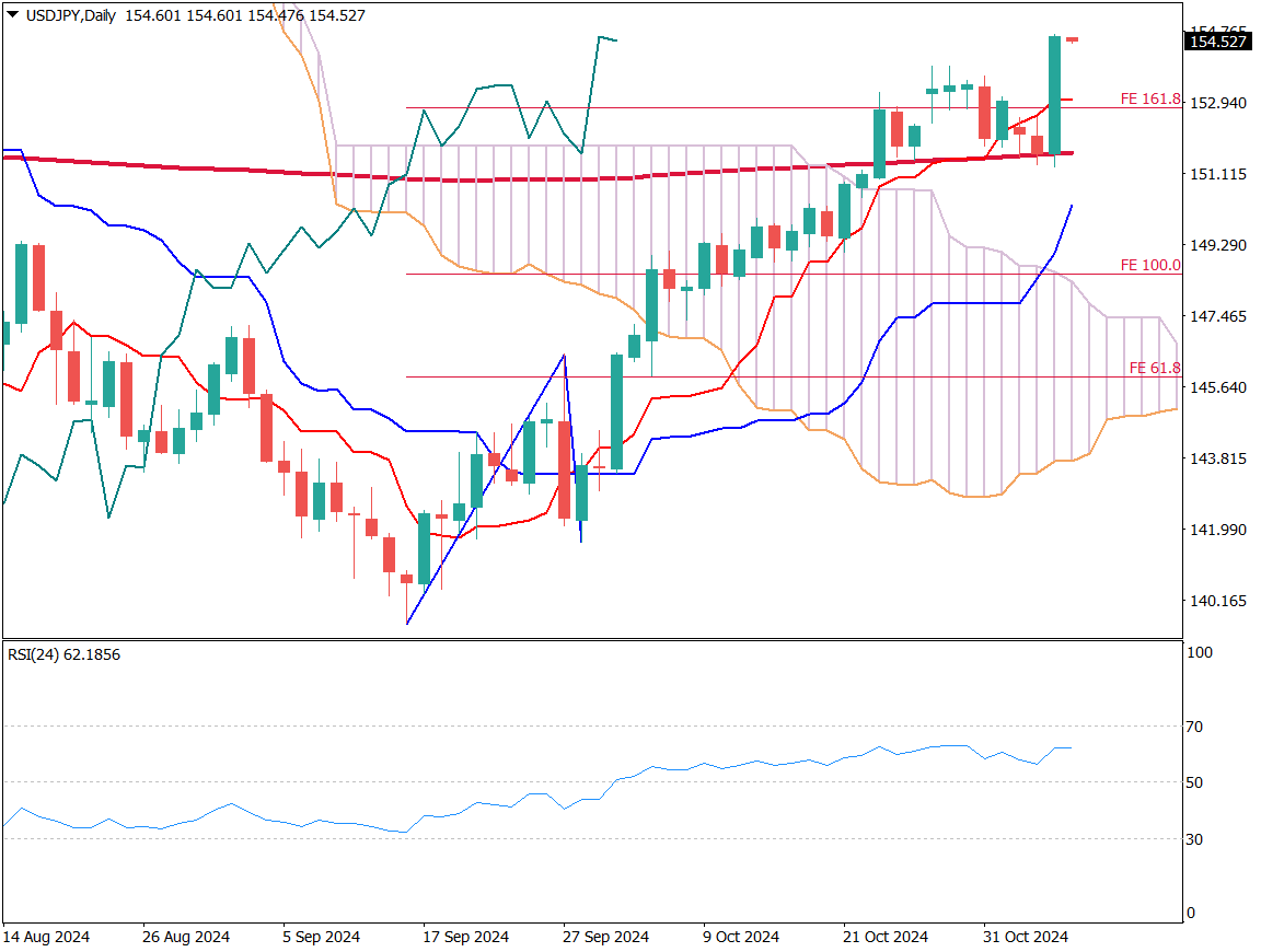 ドル円の日足チャートを分析する。ドル円は、トランプ大統領の圧勝により、早々と当選確実が判明したため、ドル高に伴って急騰。151円台から154.50円台まで急騰した。しかし、過去の大統領選挙の相場と比較すると、そこまでボラティリティは大きくならなかった。