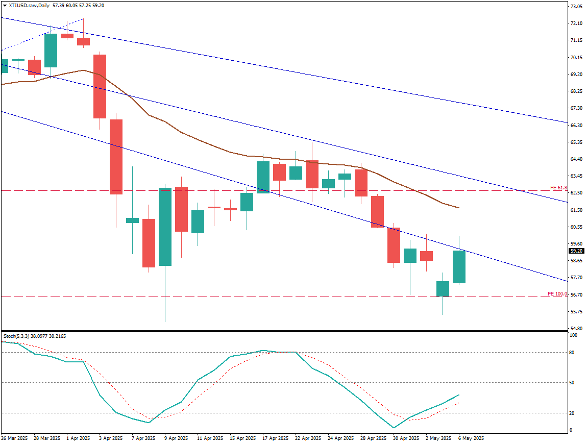 原油の日足チャートを分析する。2025年1月高値・3月安値・4月高値を起点とするフィボナッチ・エキスパンション100%水準(赤破線)の56ドルで反発しており、サポートラインとなっている。