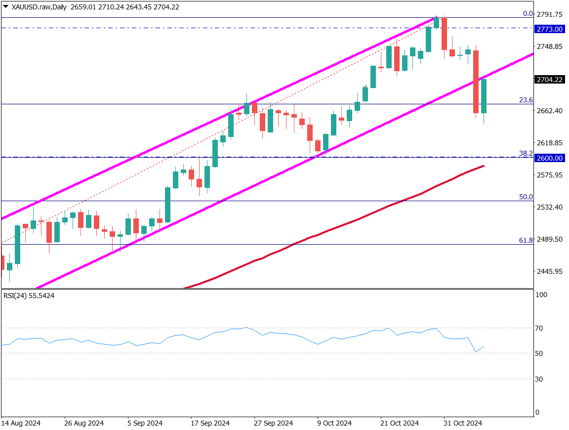 ゴールドの日足チャートを分析する。大統領選というビッグイベントが終わり、早々に当選確実になったことでゴールドは調整相場入りした。上昇チャネルを下抜けし、フィボナッチリトレースメントの23.6%を一時下回った。利下げ決定をうけて上昇チャネル下限ラインまで反発している。