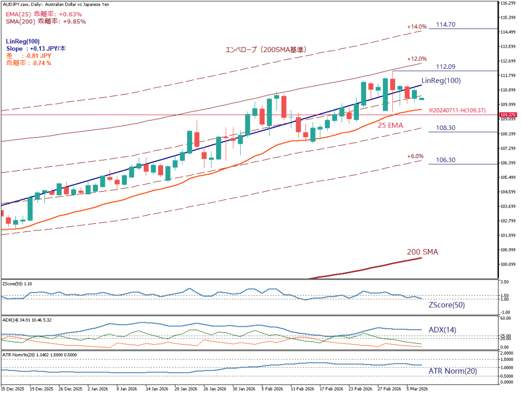 高値圏では上昇に乗り遅れた買いと利益確定の売りが交錯しやすく、現水準はその局面に差し掛かっている可能性がある。過去にはエンベロープ+14%付近まで上昇した局面も確認されており、112.09を上抜ける場合は114.70付近が次の上値目安となる。一方、下方の焦点は108.30付近であり、割り込む場合は106.30付近が次の下値目安として意識される。