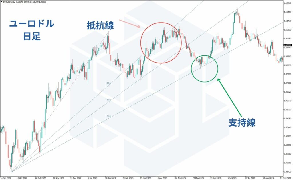 下記はユーロドルの日足チャートにフィボナッチファンを描画したチャート例です。フィボナッチファンの各線が抵抗線、支持線として意識され、相場が変動していることが確認できます。