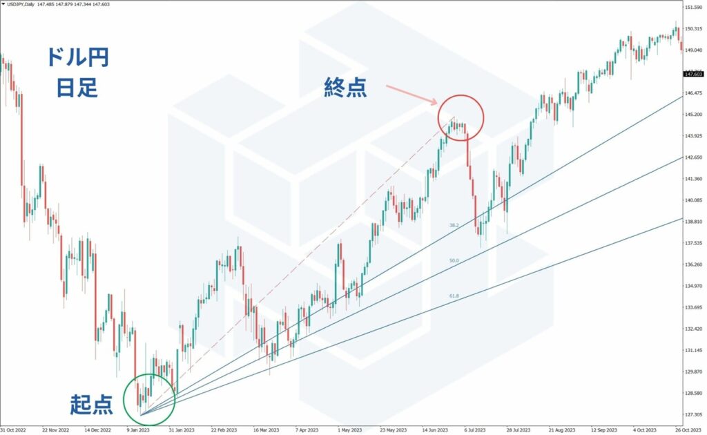 最初に、底や安値(起点)から高値(終点)までラインを引くことで上昇トレンドがわかります。どの高値や安値を選ぶかが大事です。過去の価格の動きを見て、適切な点を選びましょう。