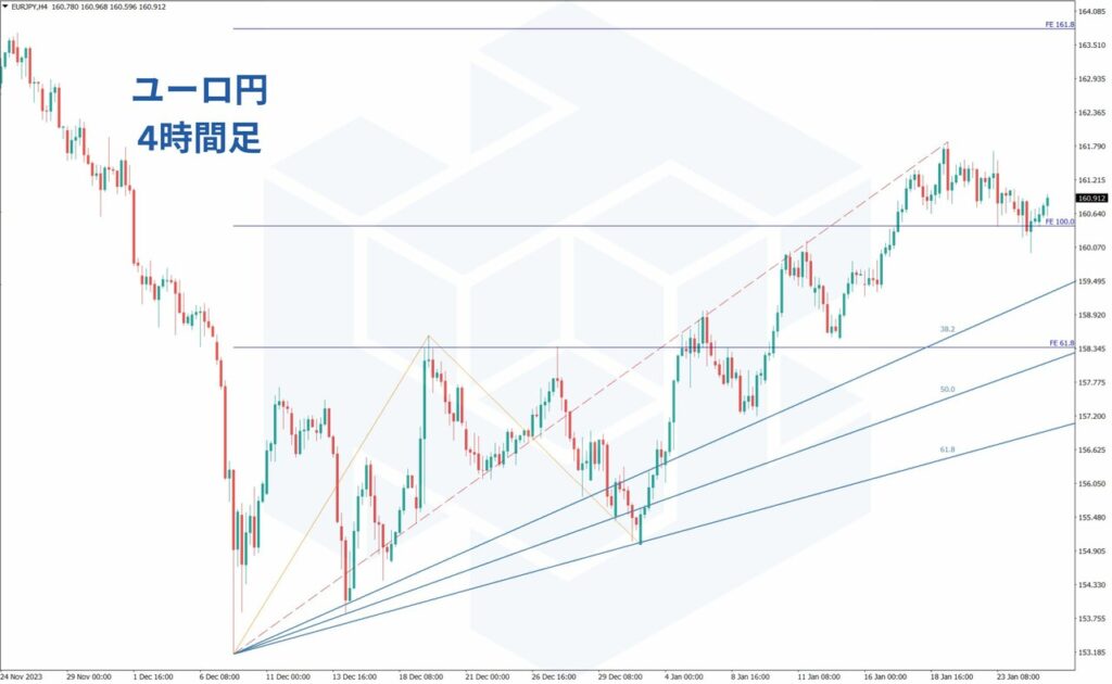 下記はユーロ円の4時間足チャートです。フィボナッチエクスパンションとフィボナッチファンが同時に意識されています。