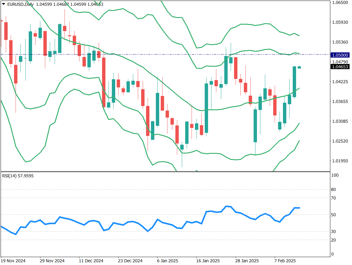 相場の方向性を左右する要因として、ウクライナ停戦交渉の行方と米国の関税政策がある。トランプ大統領は相互関税について4月の発動を検討していると報じられている。テクニカル面では、RSIが57まで上昇し、安定的な上昇基調を示している。1.05ドルを突破した場合は1.06ドルを目指す展開となる可能性が高い。