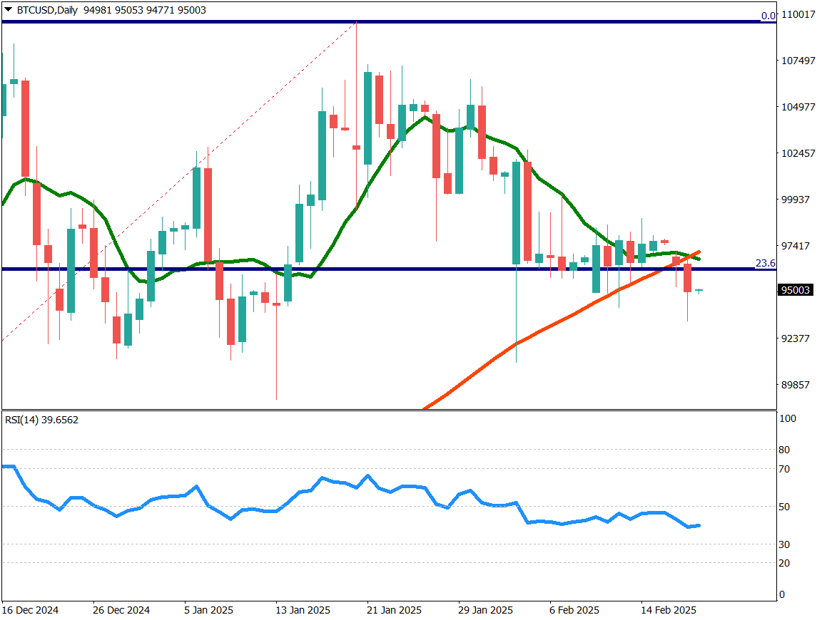 2月の相場動向について、以下の主要な展開があった。ビットコインは90日移動平均線を下回り、約3ヶ月続いた上昇トレンドが終息した。RSIは40を示し、安定的な下落傾向にある。注目は9万1000ドルの安値更新となっている。