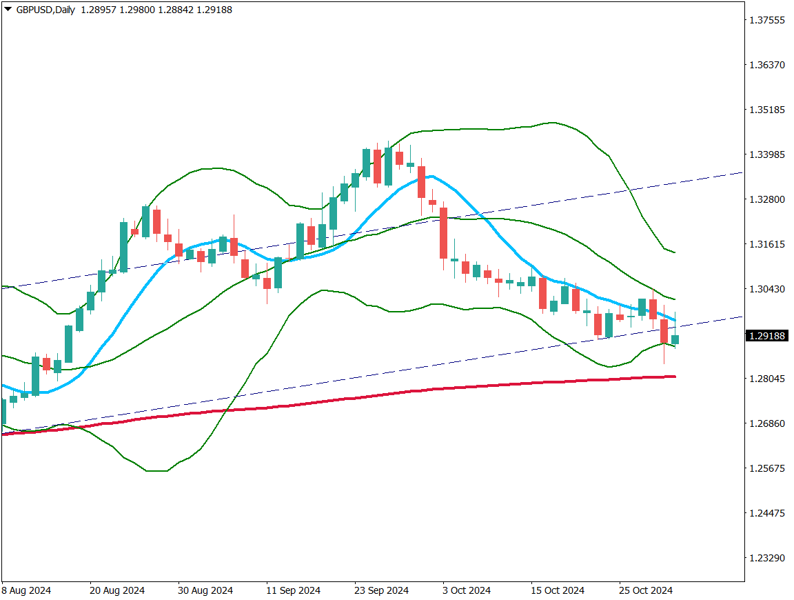 ポンドドルは下落している。10日移動平均線を割っており、上昇チャネルの下限ラインに接近。ボリンジャーバンドの-2σ線にタッチしている。来週は大統領選挙があり、米ドルの取引量が大きくなるため予想はしにくいが、英中銀は利下げすると予想されており、ポンド安米ドル高となりやすいのではないかと考える。