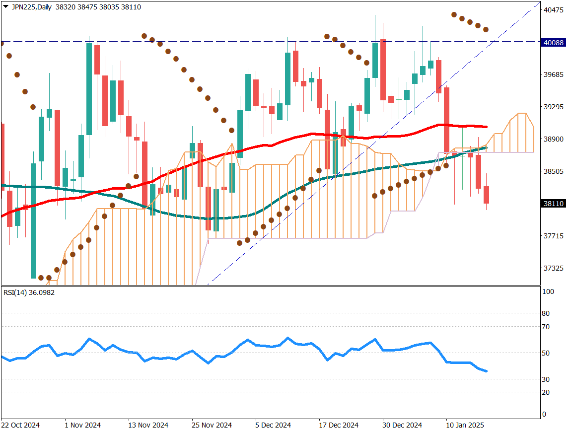 日経平均株価の日足チャートを分析する。上昇トレンドラインを割り込み、年初から下落基調となっている。52日、90日、200日移動平均線を下回っており、RSIも36で安定的な下落基調を示す水準になっている。