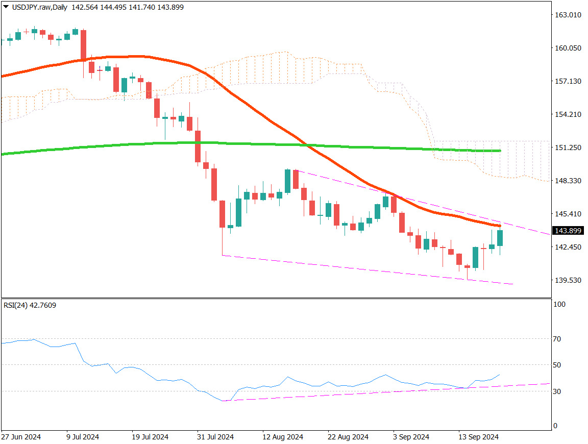 ドル円は143.89円で終値を迎えている。米FRBが大幅利下げを実施し、金利差縮小で円高になるかと思われたが、FRB議長が今後も0.50%の利下げを期待するべきではないとコメントし、ショートだった相場が巻き戻された。