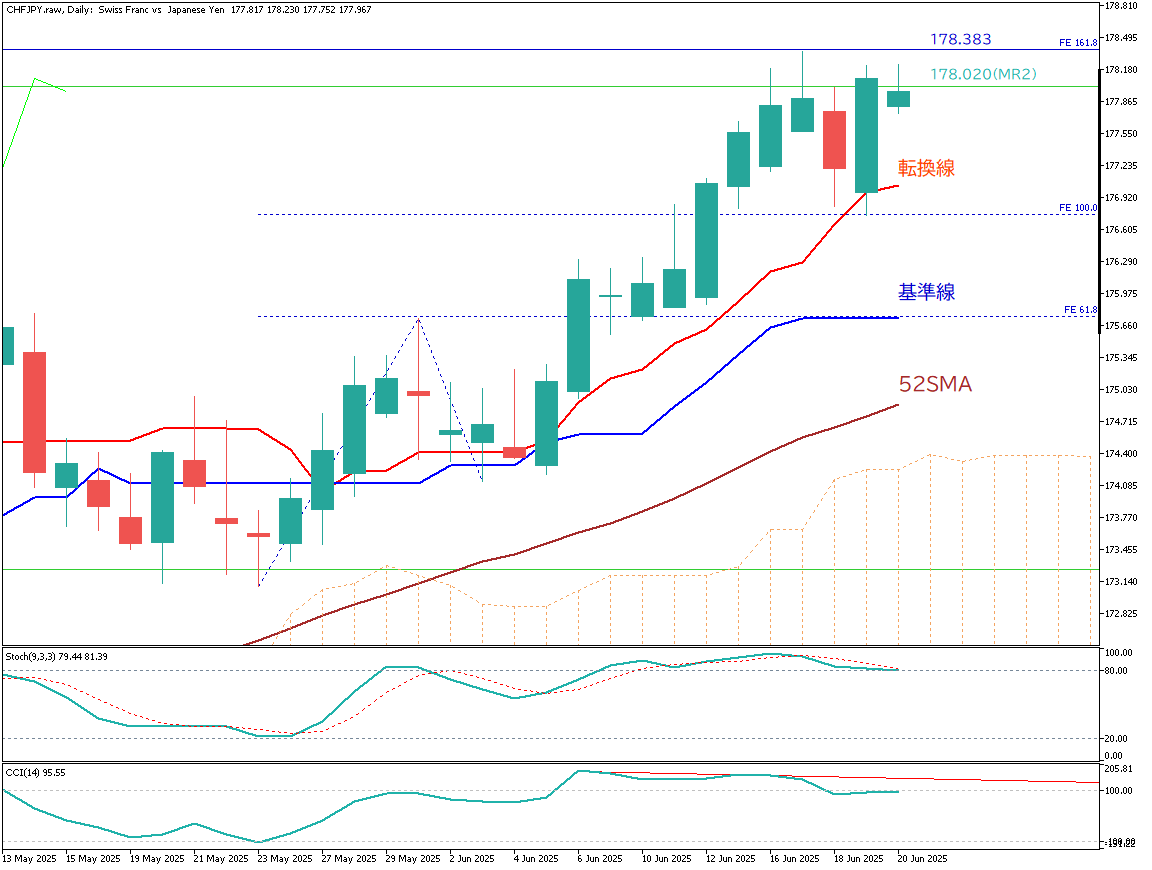 今後は、178.020円およびFE178.383円の上抜けが上昇継続のカギとなる。