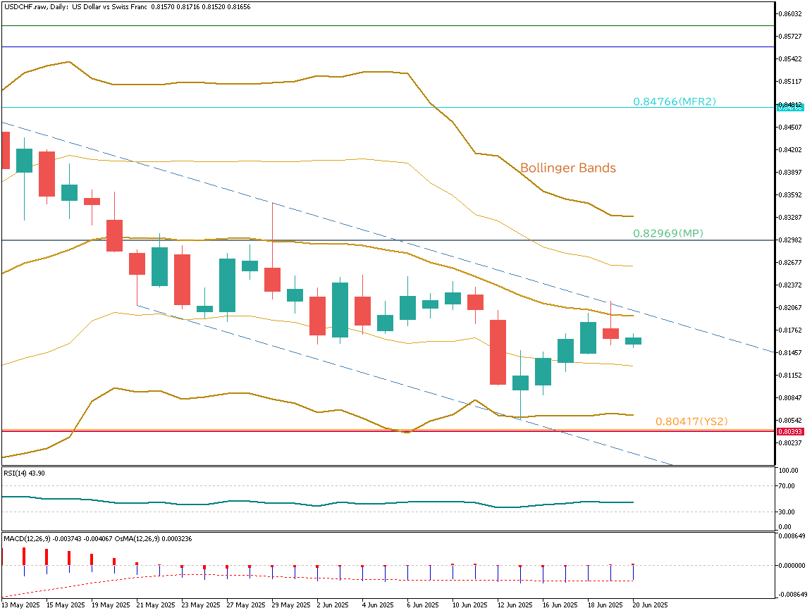 テクニカル面では、CHF/JPYは上昇基調を維持するが178円台前半で上値の重さとオシレーター系の過熱感が意識される。一方、USD/CHFは下降チャネル内で下落基調が継続し、ボリンジャーバンド下限と0.804のサポート割れで下値余地拡大が警戒される。