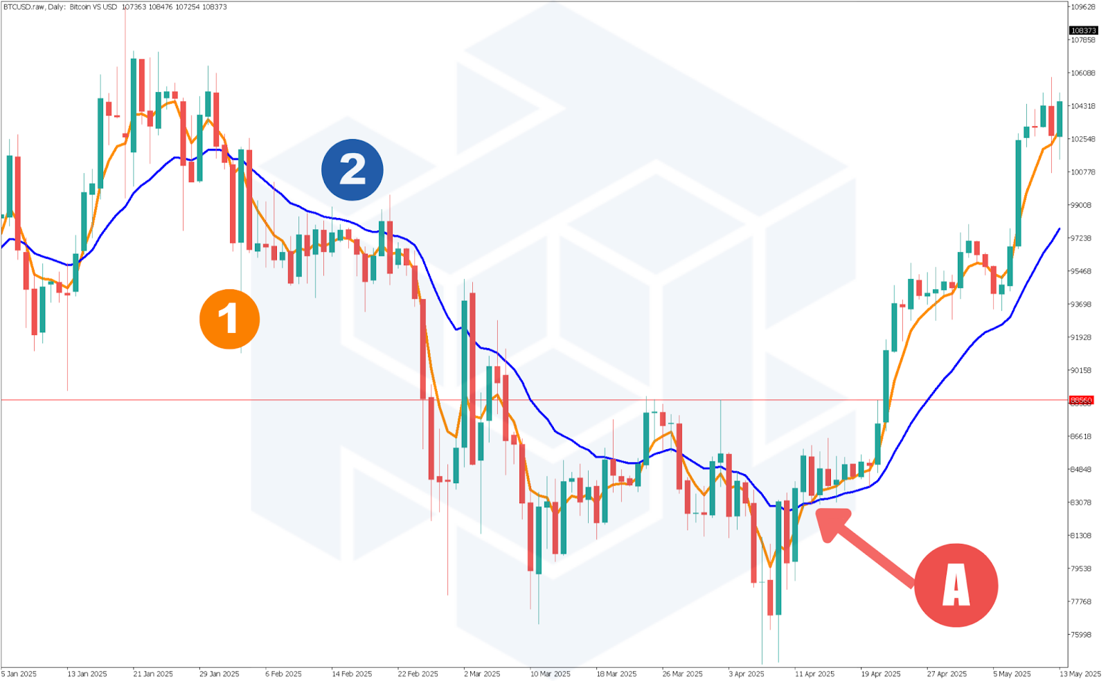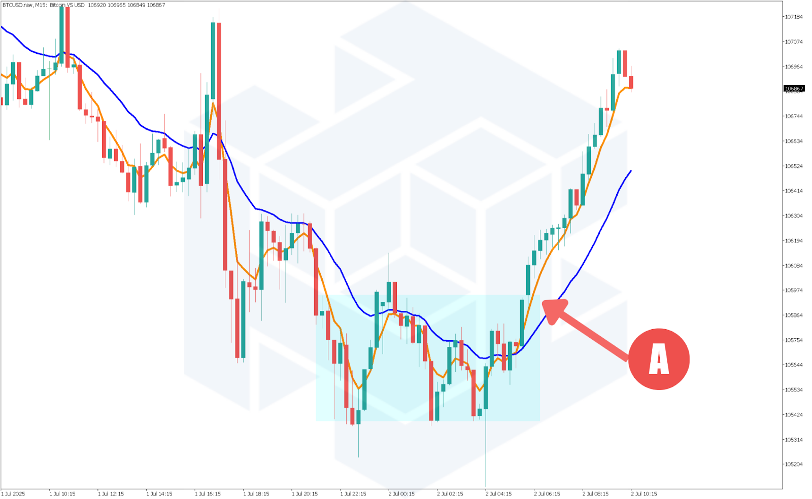 この戦略では、まず短期のEMA(例えば5期間:番号1)と中期のEMA(例えば20期間:番号2)の交差をチェックします。短期のEMAが中期のEMAを上から下に抜けたときは「デッドクロス」、下から上に抜けたときは「ゴールデンクロス」(A)と呼ばれ、トレンドの変化を示すサインになります。