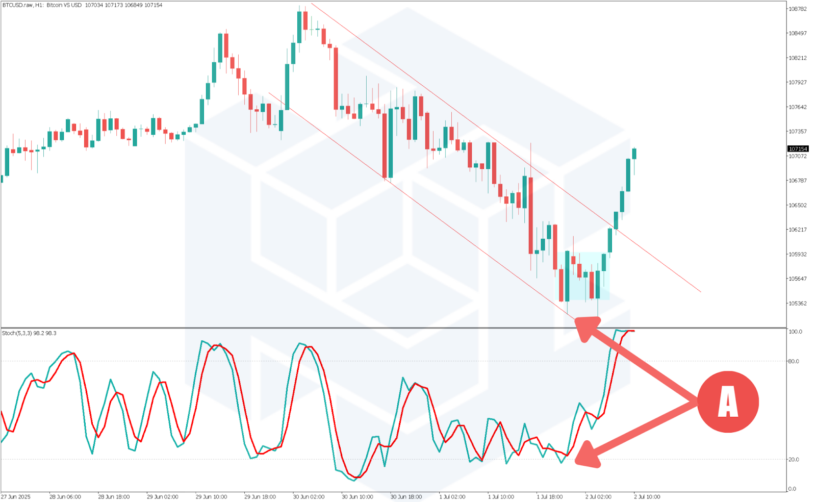 下記はビットコインの1時間足チャートに、チャネルラインとストキャスティクスを描画した図です。