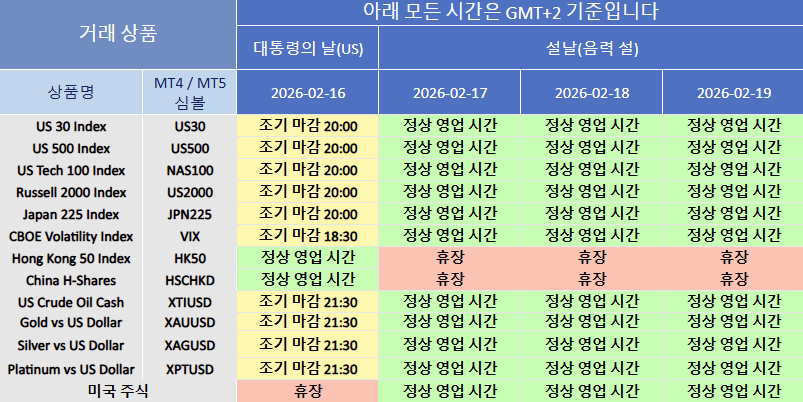 다가오는 공휴일로 인해 2026년 2월에는 관련 상품의 거래 시간이 조정될 예정입니다.
