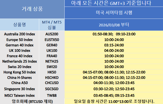 미국의 서머타임(Daylight Saving Time) 시행에 따라, 2026년 3월 중 관련 상품의 거래 시간이 조정될 예정입니다.