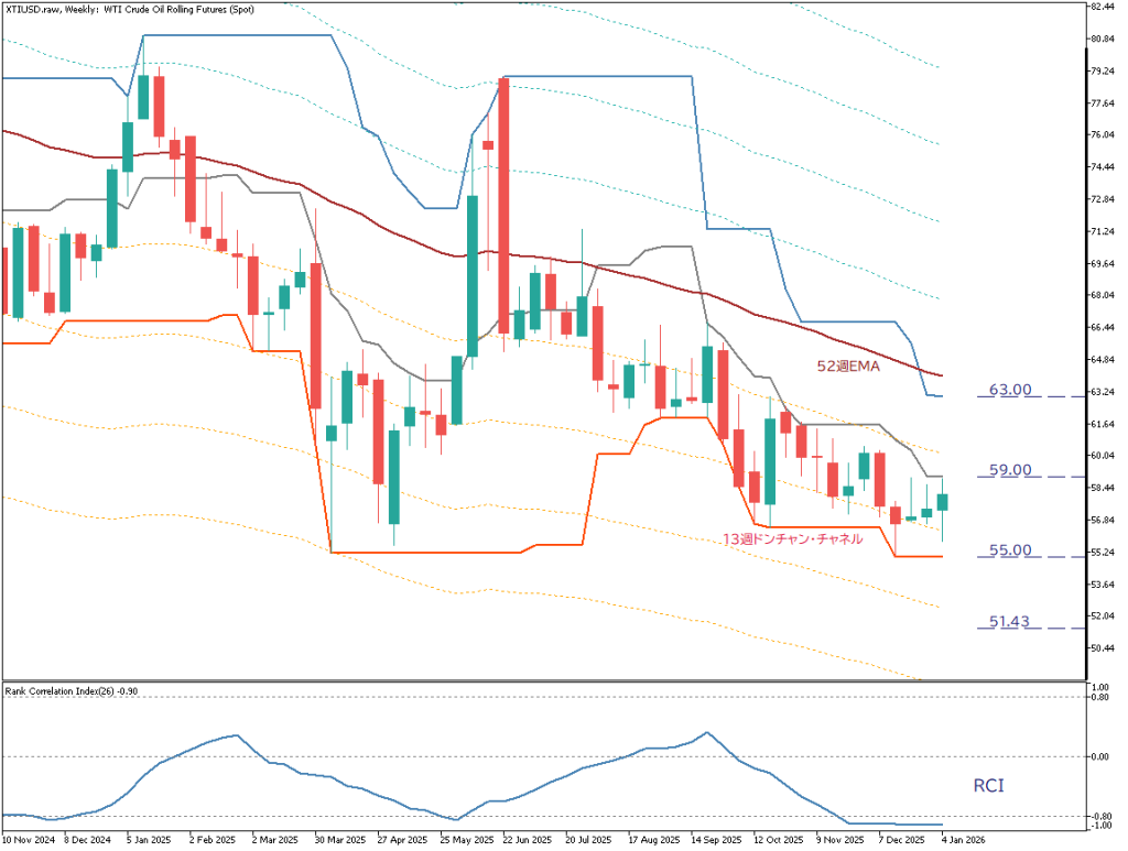 지정학적 리스크와 수급 이슈에 대한 관심이 이어지는 가운데, WTI 원유의 주봉 차트는 지난해 6월 중순 이후의 큰 변동성 이후 52주 지수이동평균선(EMA)을 명확히 하회한 상태가 지속되고 있습니다. 또한 13주 돈치안 채널의 중단선 하단 부근에서 움직이고 있어, 주봉 기준으로는 하락 추세로 해석할 수 있습니다. 가격은 지난해 4월 저점 부근에서 형성되고 있으나, 뚜렷한 반전 신호는 아직 확인되지 않고 있습니다.