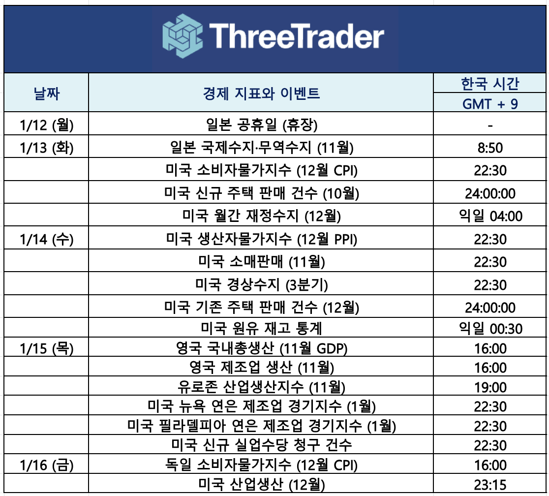 이번 주는 미국 12월 소비자물가지수(CPI)를 중심으로 소매판매, 생산자물가지수(PPI) 등 물가와 소비 지표를 통해 연준(FRB)의 정책 스탠스에 미치는 영향을 가늠하는 한 주가 될 전망입니다. 특히 미국 CPI 근원 지표가 시장 예상치와 얼마나 괴리를 보일지에 따라 달러와 금리의 방향성은 물론, 주식 및 암호자산 전반의 위험선호도에도 큰 영향을 미칠 것으로 예상됩니다.