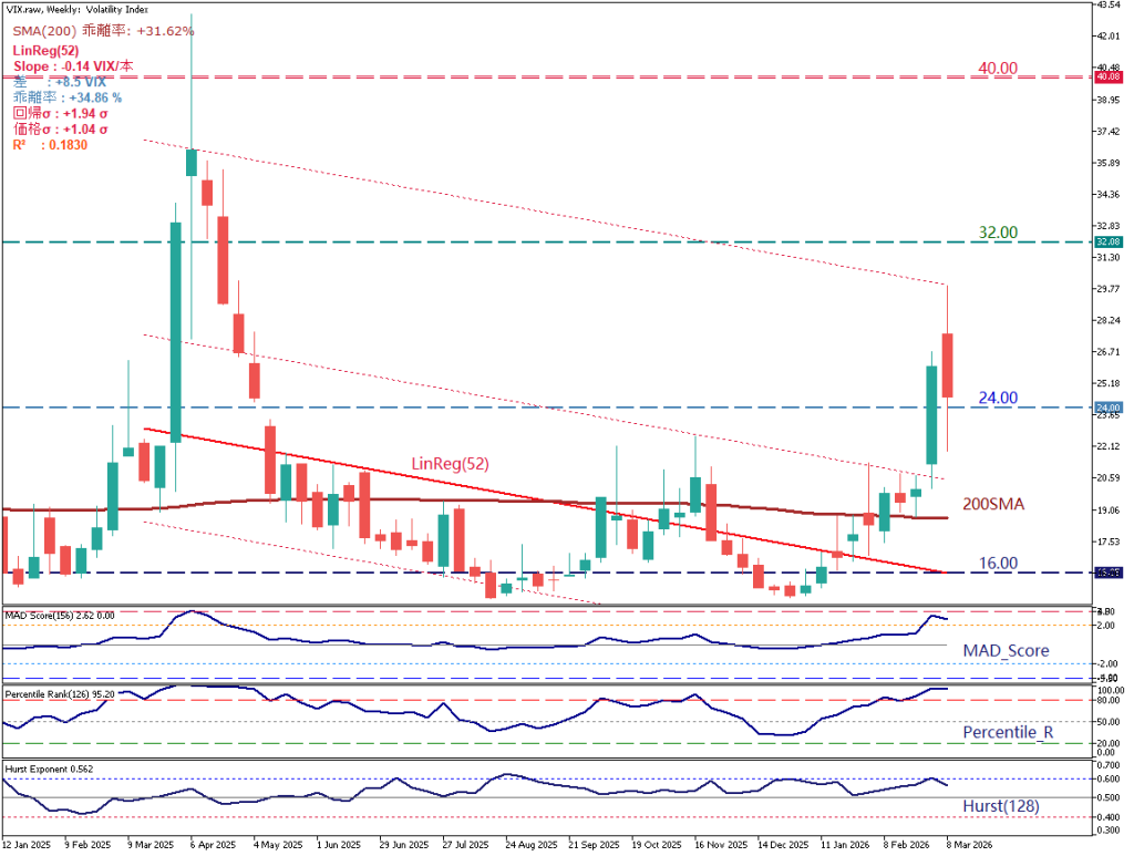 VIX 지수의 주간 차트를 살펴보면 현재 시장은 저변동성 구간에서 급등한 이후, 통계적으로 상위권 공포 수준에 위치한 고변동성 국면입니다.