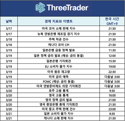 이번 주에는 주요국의 금융 정책 발표가 잇따릅니다. 일본은행(3/19), FRB(3/19), 영국 중앙은행(3/20)의 정책 금리는 모두 동결될 것으로 예상됩니다. 미국과 유럽 간의 관세 전쟁이 격화되고 있으며, 트럼프 행정부의 보복 관세 발표와 일본의 쌀 관세에도 주목이 집중되고 있습니다. 우크라이나 휴전 협상은 진전을 보이고 있는 조짐이 있습니다. 미국 금융 기관들은 미국의 성장률 전망을 하향 조정하고 있으며, 관세 전쟁으로 인한 경기 악화와 인플레이션 상승으로 인한 스태그플레이션 우려가 커지고 있습니다. S&P 500은 최고치에서 10% 하락하며 조정 국면에 들어섰습니다. 200일 이동 평균선 아래로 떨어진 것은 코로나 충격 이후 처음입니다. RSI는 24로 강한 하락 추세를 나타내고 있습니다. 비트코인도 고점에서 하락하며 지지선이 저항선으로 전환된 상황입니다.