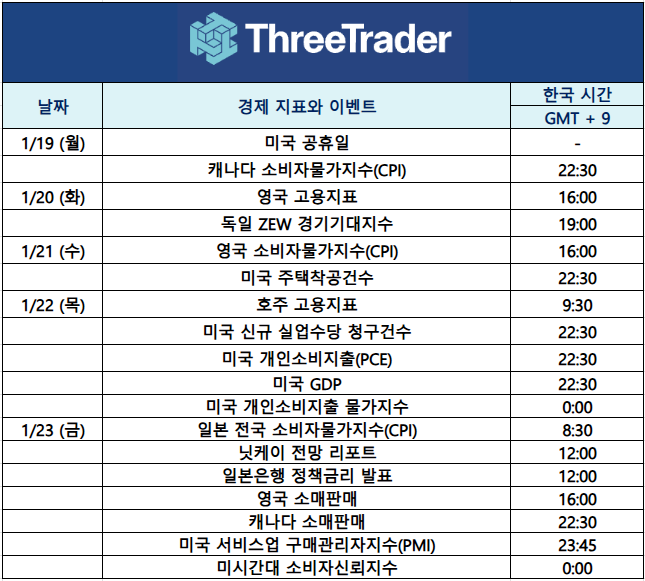 주 초인 1월 19일(월)은 미국이 공휴일로 시장 전반은 비교적 안정적인 흐름을 보일 가능성이 있으나, 캐나다 소비자물가지수(CPI)와 정책금리 발표가 예정되어 있어 캐나다 달러는 변동성 확대에 유의할 필요가 있습니다.
