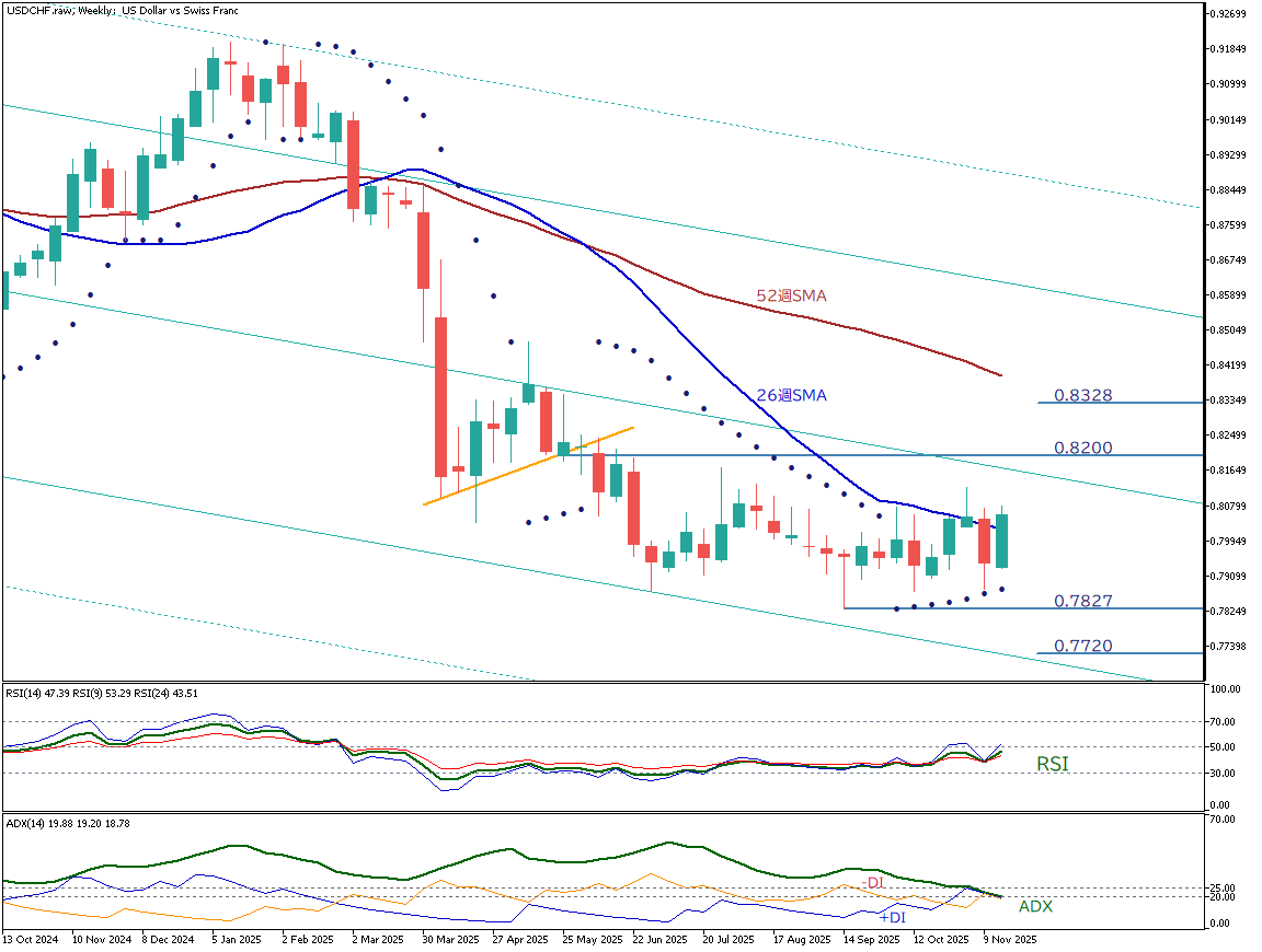 USD/CHF 주봉 차트 분석을 살펴보면, 전반적으로 하락 흐름이 이어지고 있으나, 최근에는 26주 단순이동평균(SMA)을 잠시 상회하는 움직임이 나타나며 단기적인 하락 멈춤 가능성이 관찰됩니다.