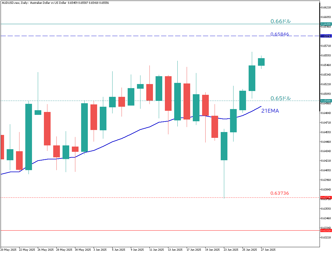 호주달러-미국달러는 현재 0.6548달러 부근에서 움직이고 있으며, 상승 채널을 따라 파동을 그리며 완만한 상승세를 이어가고 있습니다. 앞으로 종가 기준으로 고점을 갱신한다면, 다우 이론에 따른 상승 추세로 해석할 수 있습니다. 4월 중순 이후 방향성이 불분명한 전개가 이어졌지만, 최근 고점 돌파로 모멘텀이 강화되고 있으며, 특히 단기 매매세력의 손절매 주문이 몰릴 경우 상승이 가속화될 수 있습니다. 다음 목표는 라운드 넘버인 0.66달러 부근이 의식되고 있습니다.오세아니아 통화쌍은 상대적으로 가격 변동이 안정적이며 변동성도 완만한 편이나, 일단 추세가 발생하면 수주간 이어지는 경향이 있으므로, 추세 지속 여부에 계속 주목할 필요가 있습니다.