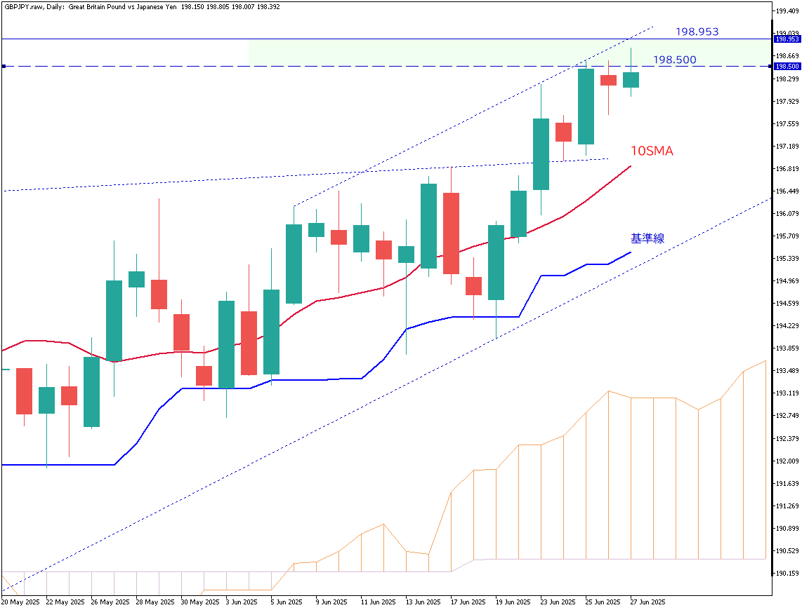 GBP/JPY의 일간 차트를 분석해보면, 일목균형표의 기준선이 지지선으로 기능하고 있으며, 지난주에는 최근 고점을 돌파하며 2024년 말 수준까지 상승한 모습입니다.