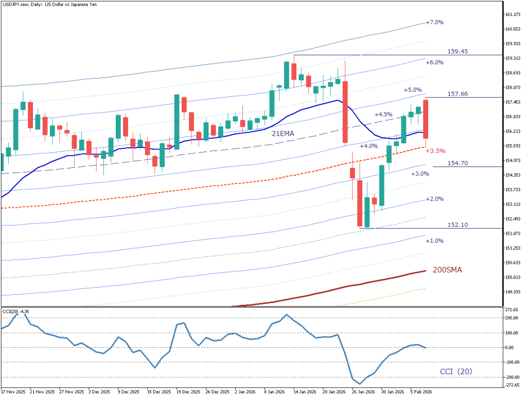 近期K线形成一根长阴线,价格自157.66日元附近受阻回落,但在包络线+3.5%附近止跌并收盘。本轮调整可视为此前推动上涨的+4.5%以上“推进带”向下回撤至历史上多次成为反弹起点的+3.5%水平。