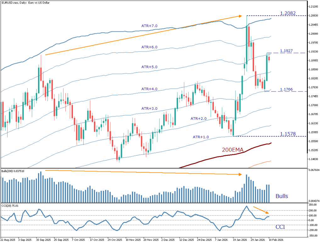 随后价格回落至+3.0水平的1.1766后出现反弹,目前自+5.0水平的1.1927小幅回落。