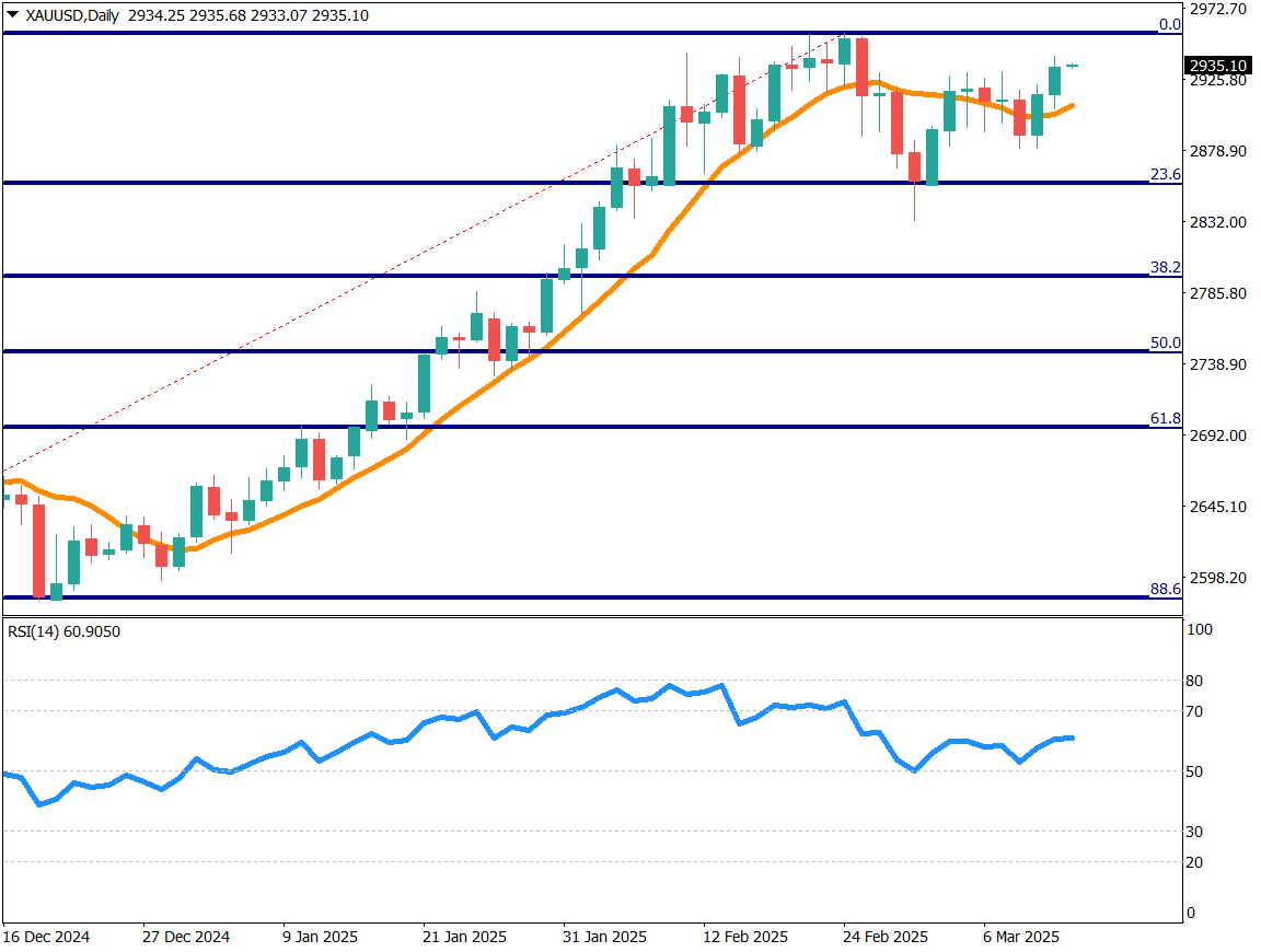 分析黄金日线图,黄金在斐波那契回撤23.6%位置形成浅层回调后,迅速受到逢低买盘支撑并反弹,再次升至2935美元。当前最高点为2956美元,市场关注是否能突破高点并延续上涨趋势。