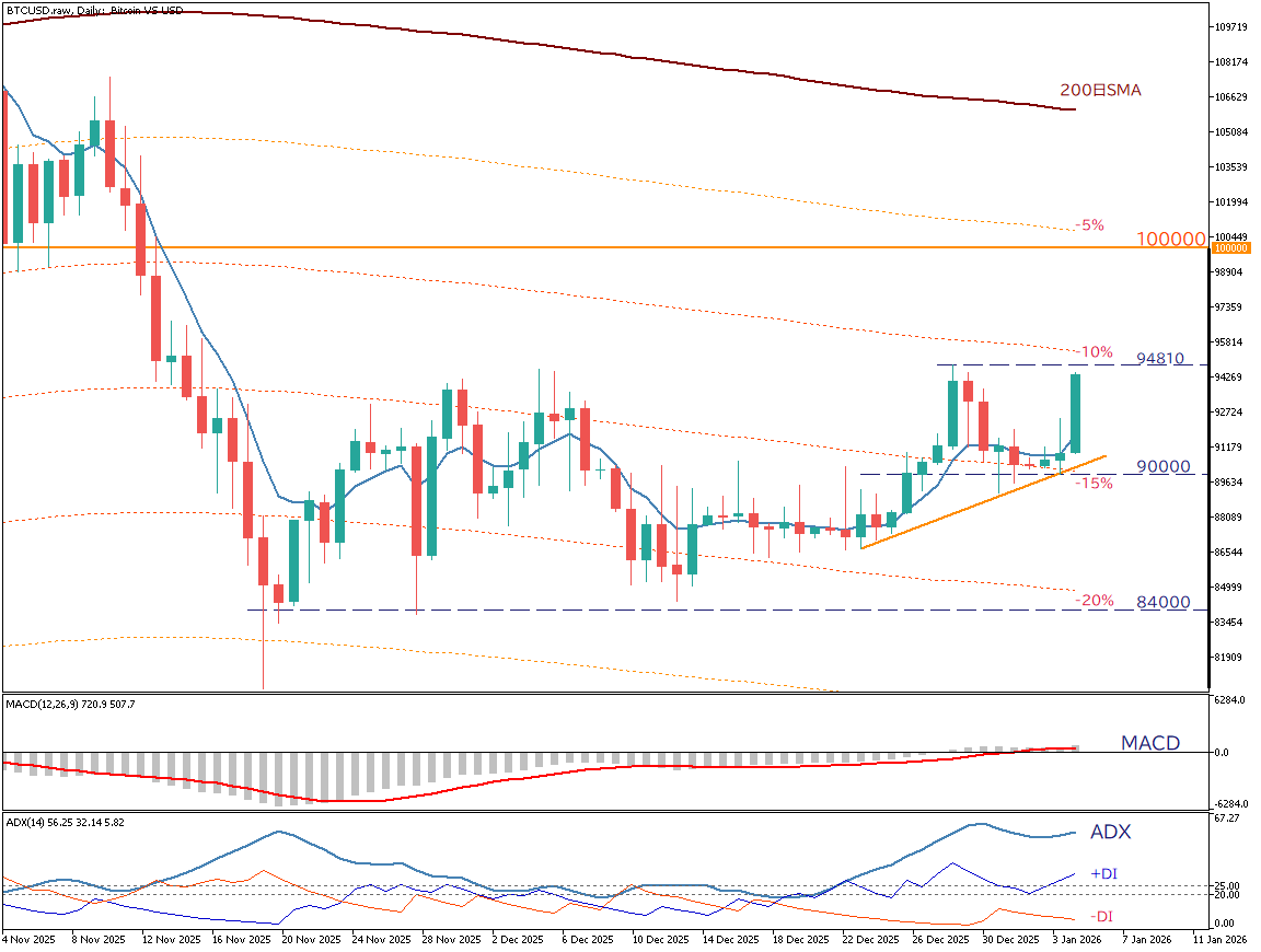 对比特币的日线图进行分析。自去年 11 月下旬以来,价格一直运行在 84,000 美元 为下限的区间内;近期下方支撑抬升至 90,000 美元 附近,区间波动进一步收敛。