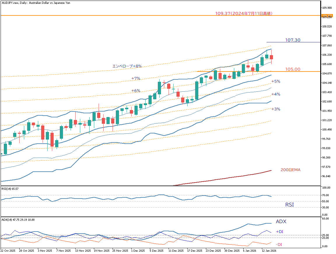 因此,能否再次向上扩展并接近 包络线 +8% 对应的107.30日元附近,将成为判断上升趋势强度的重要依据。反之,若价格 明确跌破105日元,则应视为过热修正,需要下调对趋势的整体评估。