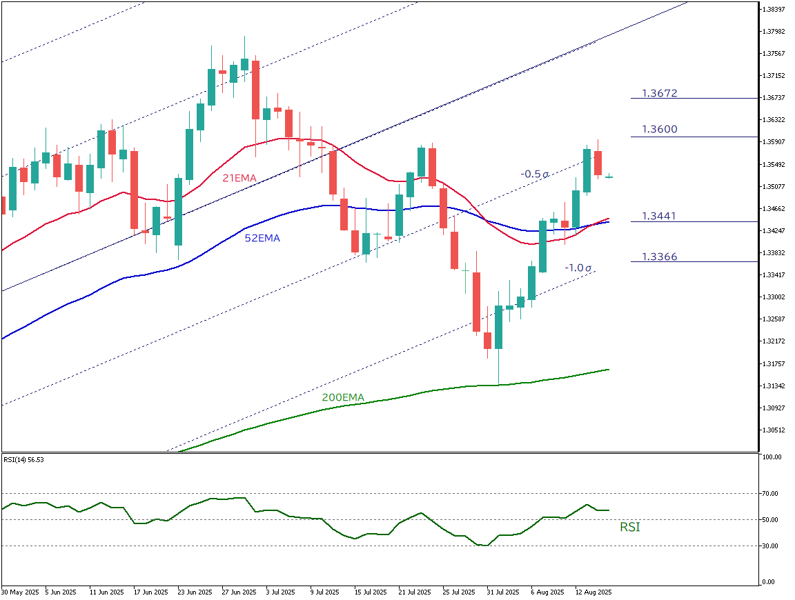 后续若升势延续,1.3600与1.3672美元将是重要阻力;若回落,52EMA所在的1.3441美元及下方1.3366美元将是关键支撑位。
