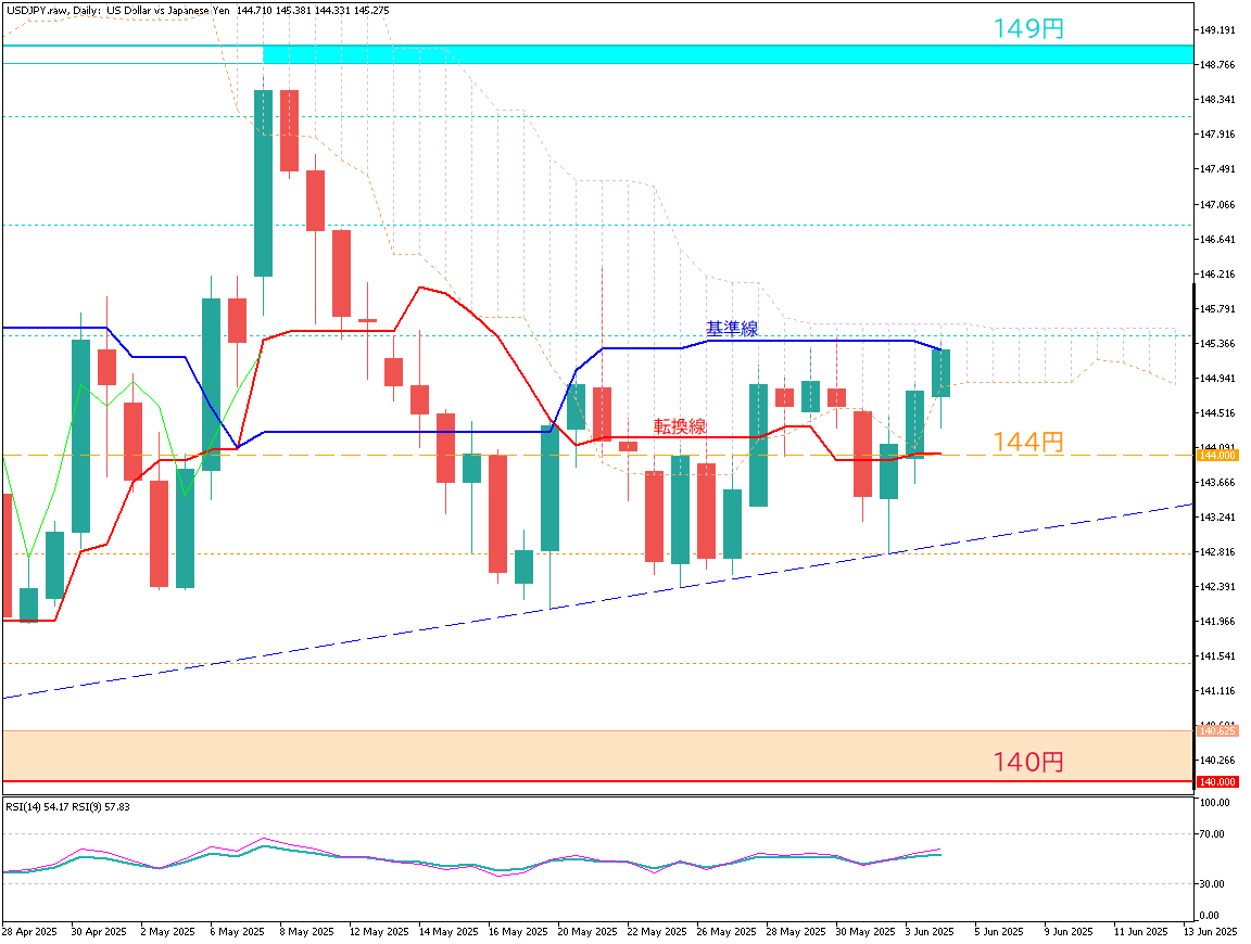 分析美元/日元(USD/JPY)日线图,目前行情围绕144日元附近呈强烈震荡盘整态势,走势趋于横盘。