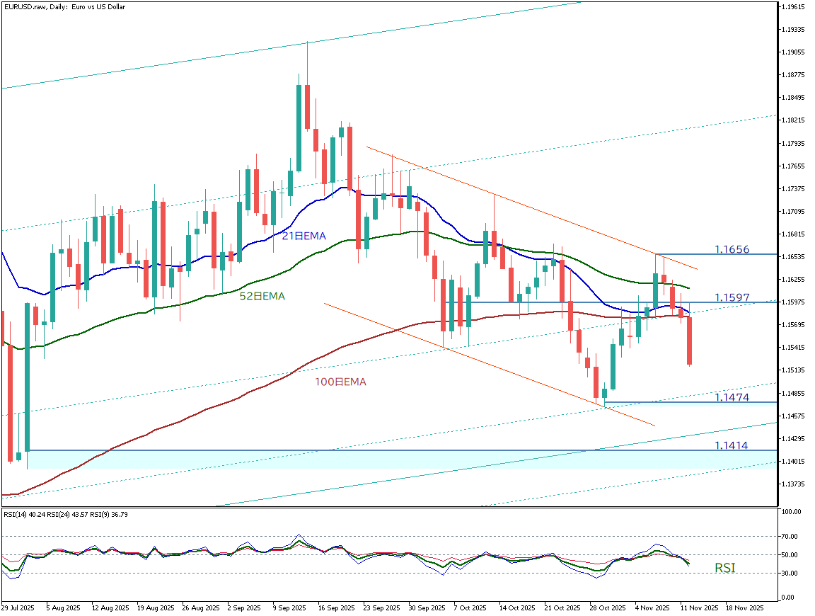 对欧元兑美元的日线图进行分析。汇价自 9 月中旬以来持续走弱,目前仍处于调整阶段。