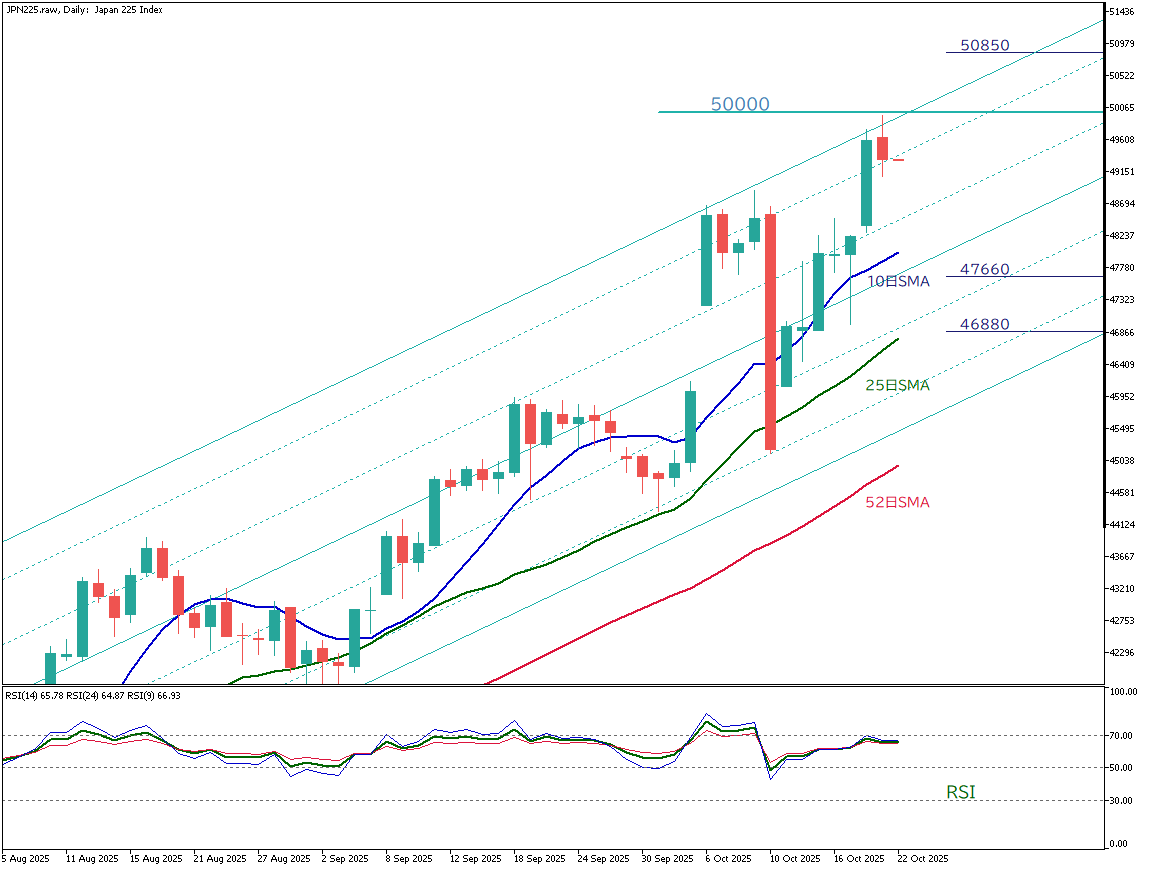 短期上方目标为5万点,若成功突破,则下一关注点将指向50,850点;若出现回调,47,660点与46,880点附近预计将提供支撑。