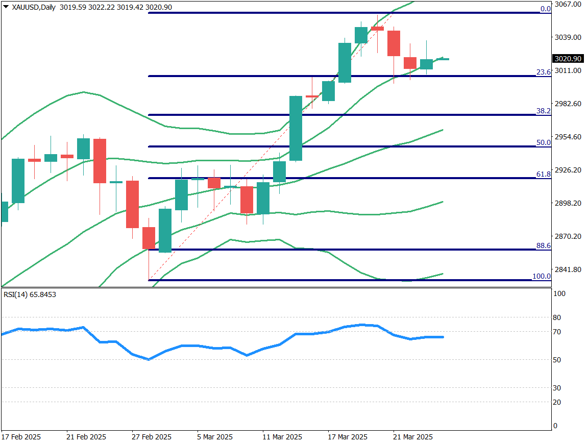 从日线图来看,黄金在上涨至3050美元附近后出现明显回调,目前已回落至3020美元附近。当前价格运行在布林带的+1σ线上方,市场关注其是否会再次展开上行走势。