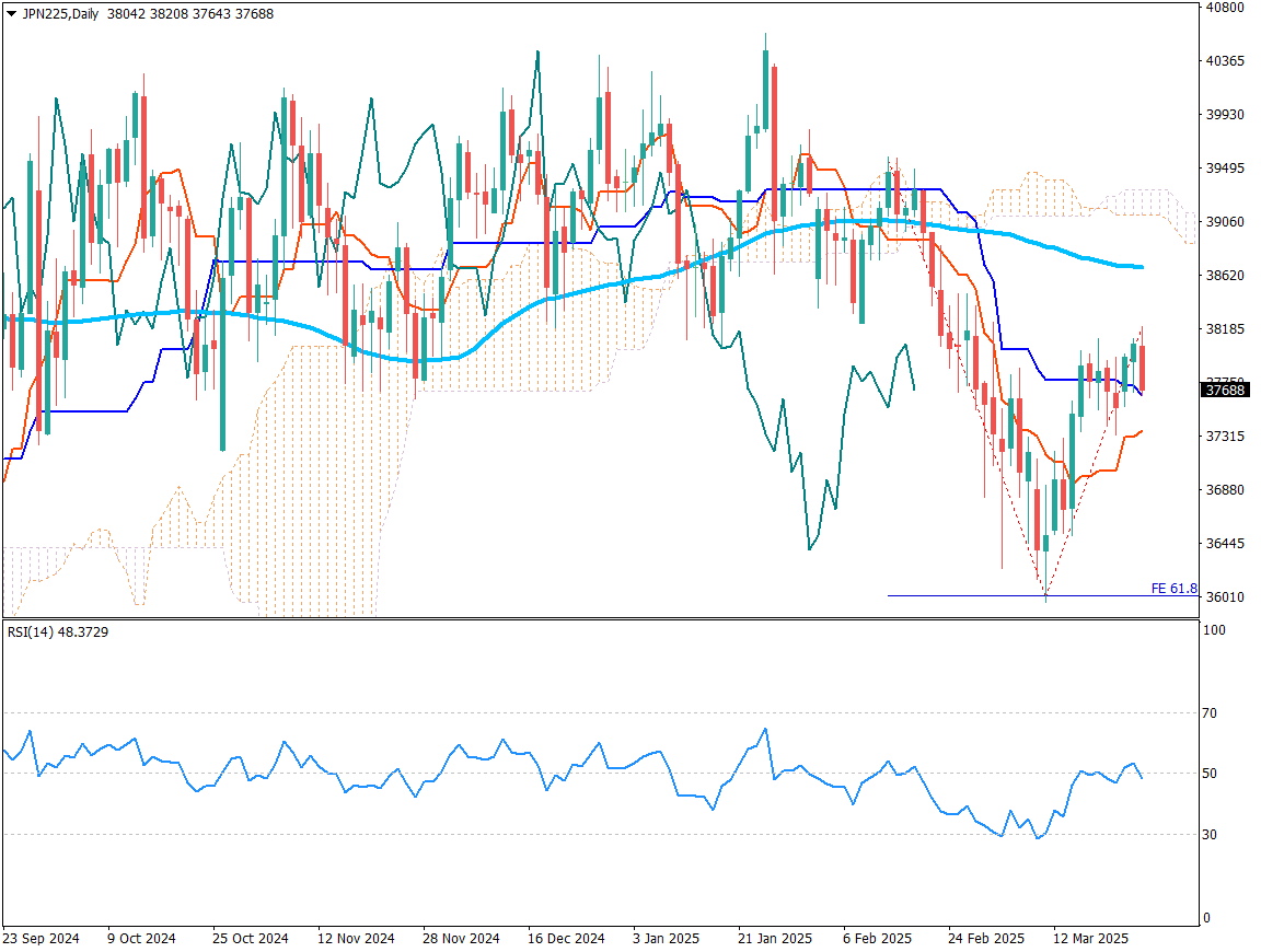 特朗普政府宣布对包括日本汽车在内的进口汽车征收25%的关税,预计将对日本汽车产业造成冲击。受此影响,日经平均指数下行压力加剧,正在形成“圆弧顶”形态,极有可能下探近期低点36000日元。RSI为48,走势偏弱,已出现卖出信号的迹象。此外,日本企业迎来除权日,也加剧了股价的下行压力。