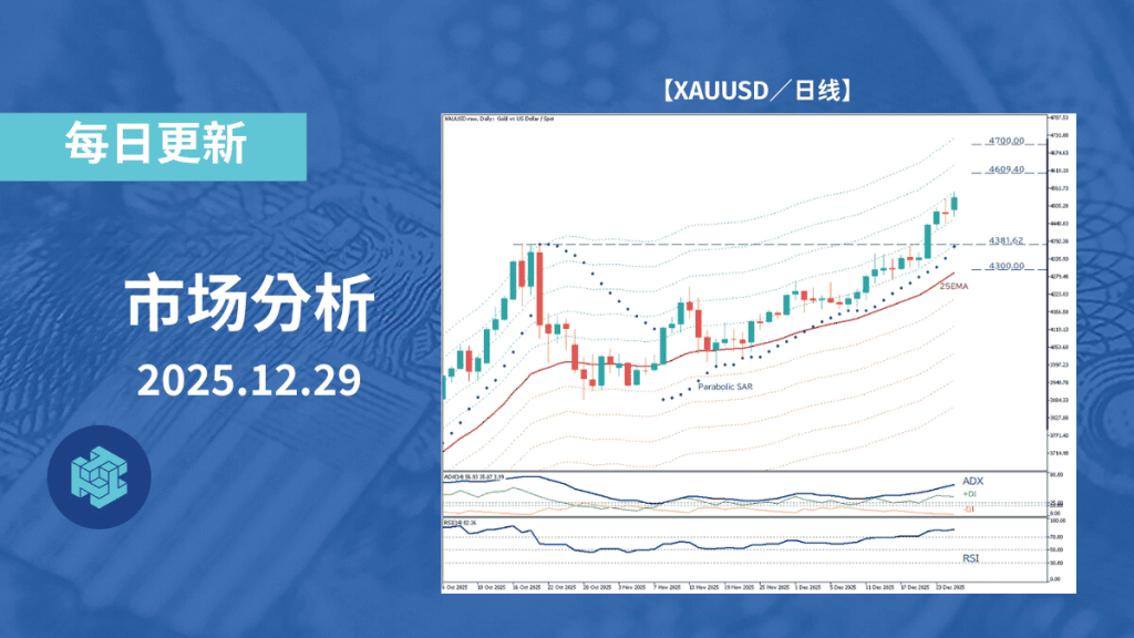 对黄金日线图进行分析。价格突破 2025 年 10 月 20 日形成的历史高点 4381.62 美元后,上升趋势进一步延续。