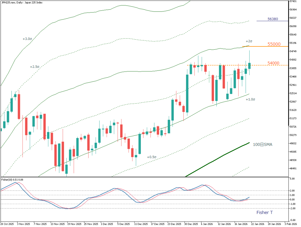 今后,54000日元能否有效突破并站稳将成为市场关注焦点。若该水平得以维持,上升趋势延续的情景将更为有力;若跌破该位置,则可能回踩布林带+1σ或中轨水平,并进入重新评估趋势持续性的阶段。整体来看,当前上升结构仍保持完整,市场偏向于乐观判断。