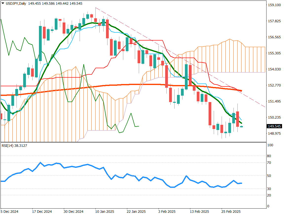 分析美元日元日线图。在特朗普总统发表批评日本货币贬值政策并威胁征收关税的言论后,美元兑日元汇率从151日元暴跌至149.50日元。再次跌破10日均线。如果您注意蜡烛的形状,您可以看到它已形成包装,并且价格已在 10 日均线处下跌。