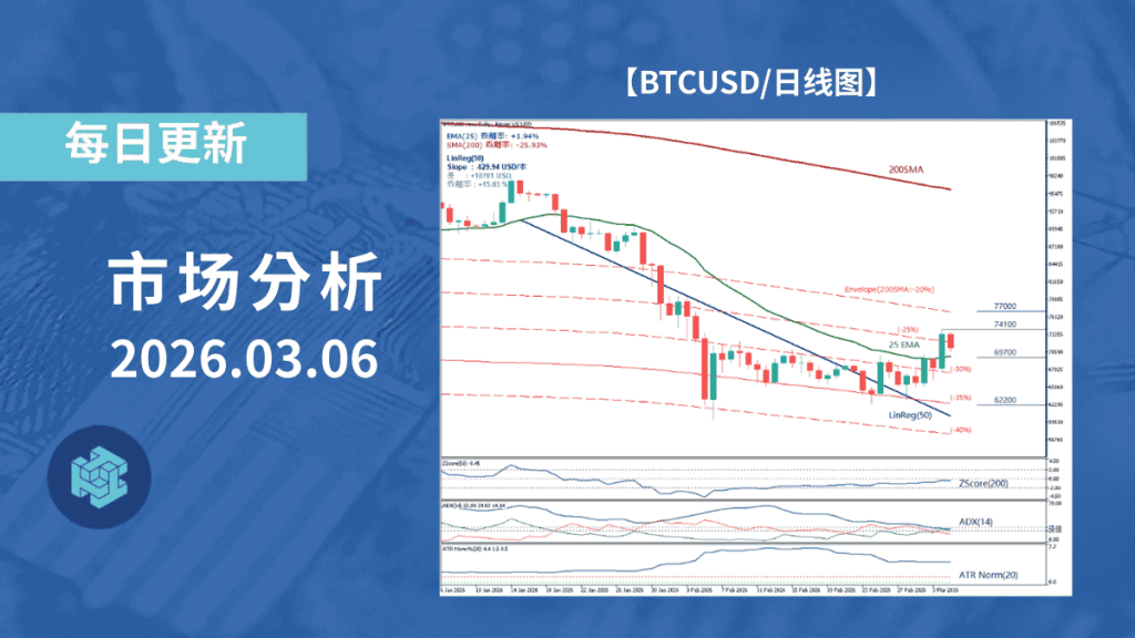 图表下方指标显示,ZScore(50)已从过热区回落至接近中性区域,统计上的过热状态正在逐步缓解。ADX(14)维持在20出头区间,趋势强度处于中等水平,但经历急跌后方向性有所减弱。ATR Normalized(20)近期上升,表明短期波动率正在扩大。