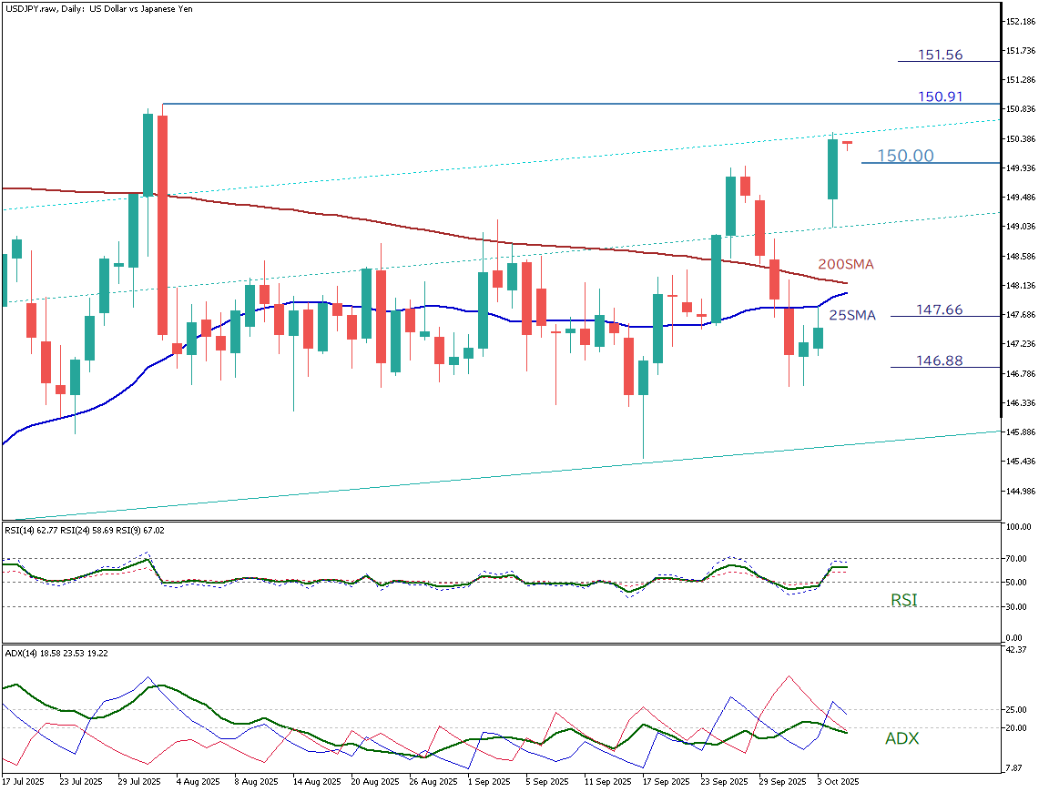 从日线图来看,昨日K线跳空上扬,强势突破关键心理关口150日元。然而,从移动平均线观察,25SMA呈横向走势、200SMA仍向下倾斜,显示上升趋势尚未完全确立。